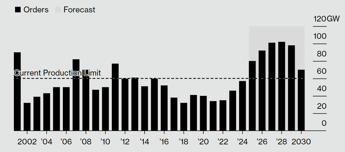 Суть узкого места заключается в том, что существует всего три основных поставщика самых крупных турбин для электростанций, с заводами от Германии до Японии, и они не способны — или не готовы — достаточно быстро нарастить производственные мощности, чтобы удовлетворить быстрорастущий спрос.