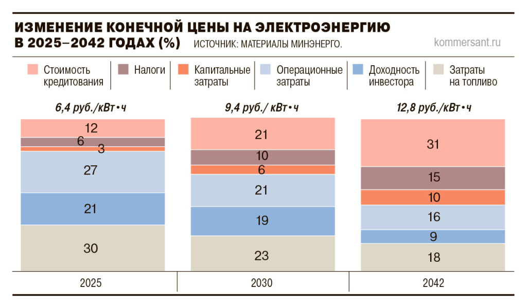 «Сообщество потребителей энергии» (лобби крупной промышленности, включает «Роснефть», НЛМК, СИБУР, «Русал») в письме министру энергетики Сергею Цивилеву (“Ъ” видел обращение от 21 октября) поставило под сомнение ряд инициатив, связанных с консолидацией отраслевого заказа в электроэнергетике на базе компании «Росэнергопроект». С этой идеей Минэнерго выступило в сентябре, апеллируя к тому, что в условиях высоких кредитных ставок и сужения доступности средств конечная стоимость электроэнергии к 2042 году может вырасти вдвое (см. график).