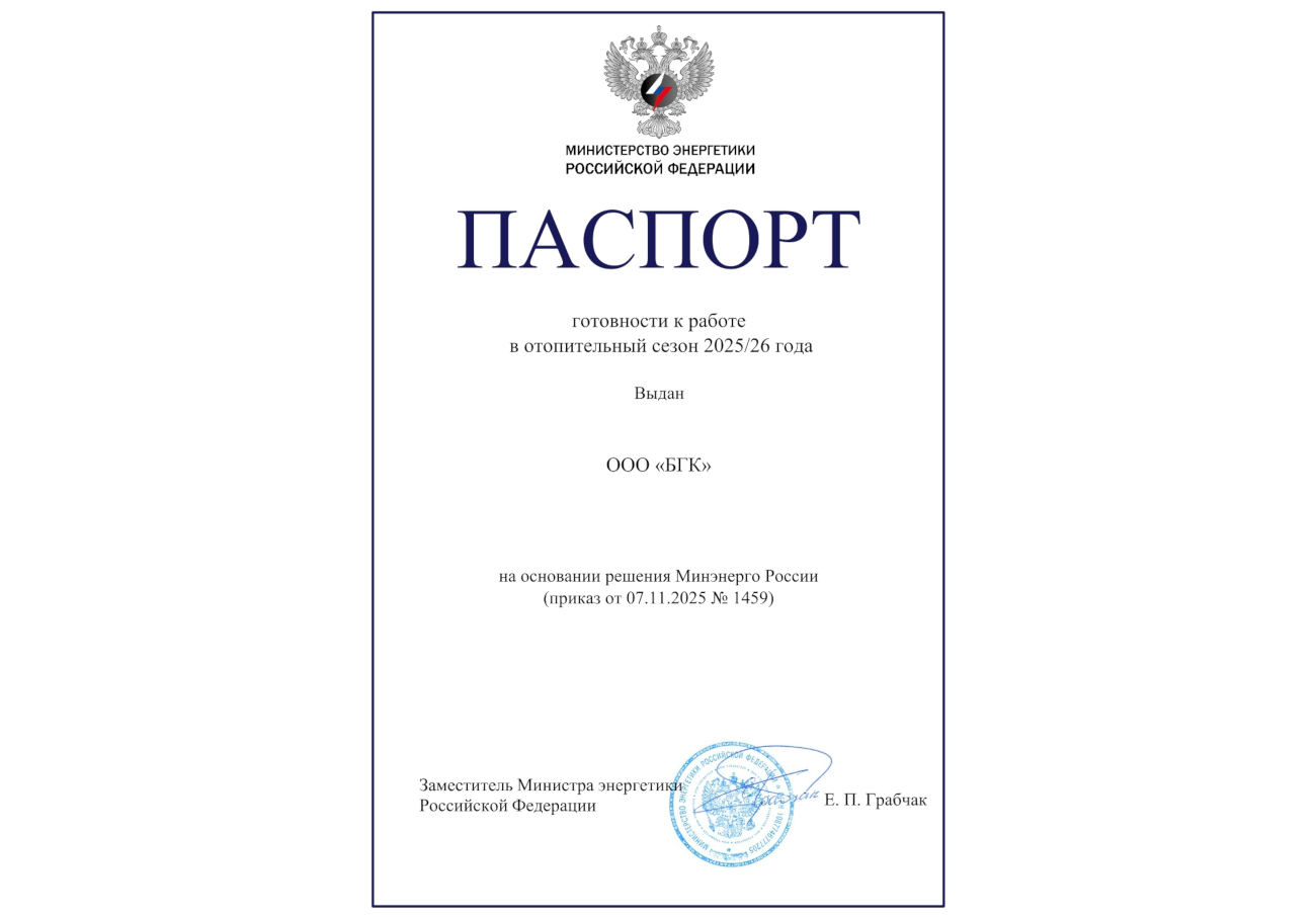 Паспорт готовности к работе в отопительный сезон выдан ООО «БГК» на основании решения Минэнерго России (приказ от 07.11.2025 № 1459).