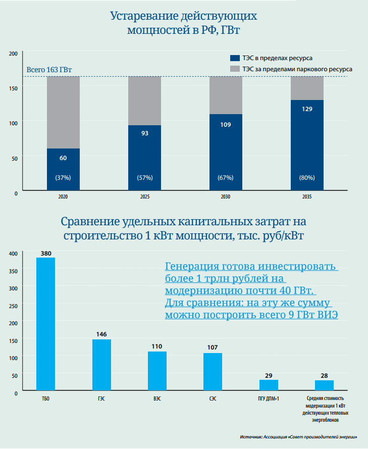 В 2010–2017 годах в рамках программы ДПМ было введено 33 ГВт новых мощностей ТЭС, 5,1 ГВт АЭС и 3,7 ГВт ГЭС. В это же время вывод старых мощностей осуществлялся значительно более медленными темпами – лишь 13 ГВт за восемь лет, что обеспечило профицит мощностей в Единой энергосистеме России (ЕЭС). Однако новые вводы не способны гарантировать надёжность энергосистемы, особенно в случае возможного роста потребления. По данным Vygon Consulting, средний возраст ТЭС, работающих на оптовом рынке, за восемь лет вырос с 31,6 до 32,2 года. Сейчас за рамками паркового ресурса работает 74% тепловых мощностей (110 из 149 ГВт). При этом ситуация с изношенностью мощностей в разрезе регионов и зон свободного перетока (ЗСП) выглядит по-разному: средний возраст теплового геноборудования в ЗСП «Северная Тюмень» составляет 9 лет, а в Мурманской области – 56 лет. В России до сих пор эксплуатируется более 100 МВт оборудования, введённого в 1930-е годы, отмечают в Vygon Consulting.