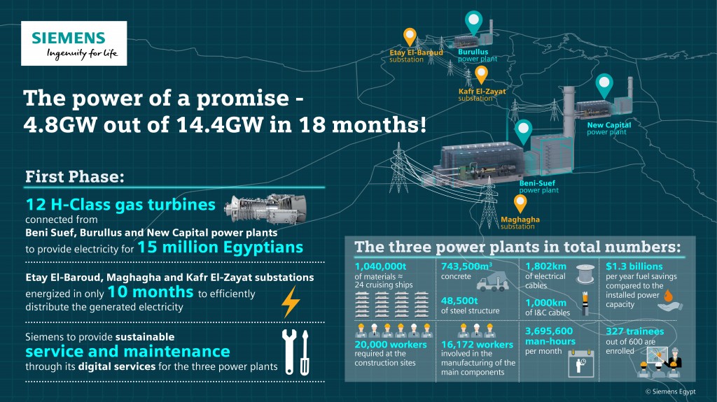 Each of the three power plants are powered by eight SGT5-8000 H-class gas turbines, 4 steam turbines, 12 generators, 8 Siemens heat recovery steam generators, 12 transformers as well as a 500-kilovolt gas-insulated switchgear. To improve the resilience of Egypt’s power grid, Siemens has successfully energized six substations that will transmit electricity generated by the new power plants. The company has also provided training to 600 Egyptian engineers and technicians, who will be responsible for operating and maintaining the plants, helping to expand skills and knowledge of the local workforce.