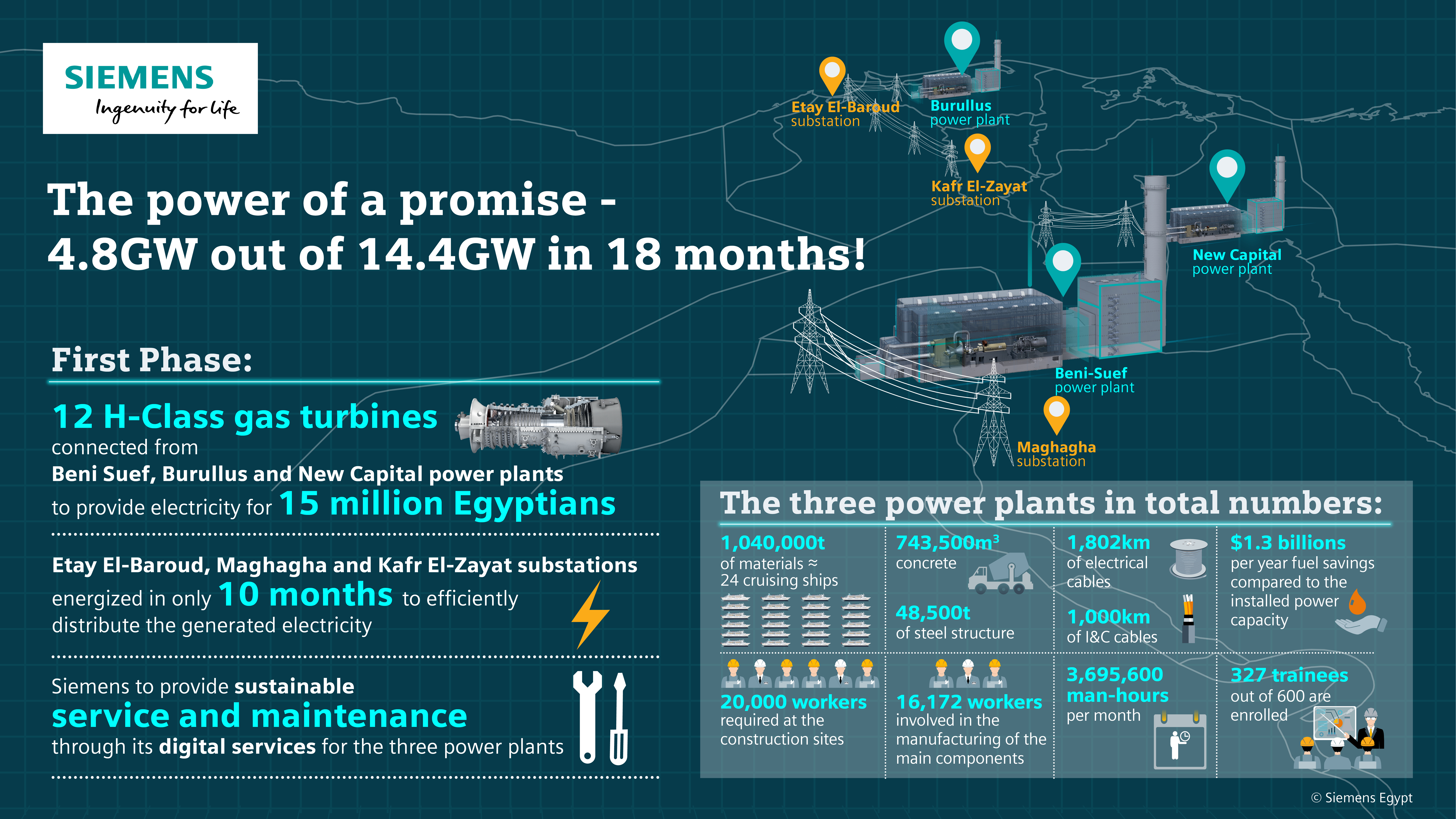 In collaboration with the Egyptian Ministry of Electricity and Renewable Energy, Siemens and its consortium partners, Orascom Construction and Elsewedy Electric, announced today the completion of the Egypt Megaproject in record time. The parties celebrated the combined cycle commissioning and the start of operations at the Beni Suef, Burullus and New Capital power plants. The stations will add a total of 14.4 gigawatts (GW) of power generation capacity to Egypt’s national grid, enough power to supply up to 40 million people with reliable electricity. With this milestone, Egypt and Siemens have set a new world record for execution of modern, fast-track power projects, delivering 14.4 GW of power in only 27.5 months. A single combined cycle power plant block with a capacity of 1,200 megawatts typically takes approximately 30 months for construction. For the Egypt Megaproject Siemens in parallel built twelve of these blocks in record time and connected them to the grid.
