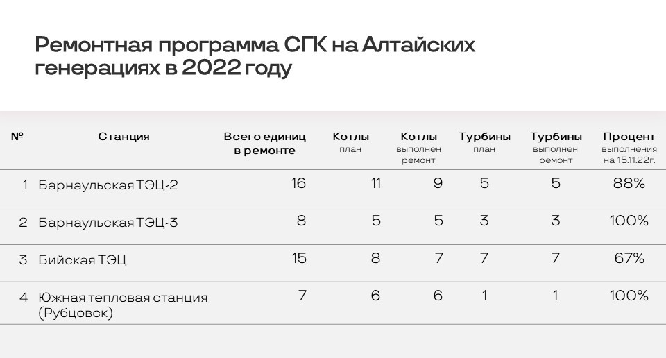 До конца декабря будет выполнен текущий ремонт на двух котлоагрегатах Барнаульской ТЭЦ-2 №15 и №18 производительностью 210 тонн пара в час. Поочередный вывод из работы этих двух котлоагрегатов также не повлияет на способность станции поддерживать выработку тепла и электроэнергии в отопительный сезон. На оборудовании Барнаульской ТЭЦ-3 и Южной тепловой станции в Рубцовске ремонтная программа СГК на 2022 год выполнена полностью.