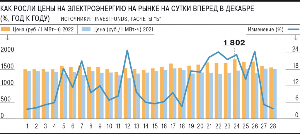 Оптовые цены на электроэнергию в первой ценовой зоне энергорынка (европейская часть РФ и Урал) снова вернулись к росту: с начала декабря показатель увеличился примерно на 12% год к году. Самое заметное увеличение цен на рынке на сутки вперед (РСВ) произошло с 19 по 26 декабря: индекс, по оценкам “Ъ”, вырос на 20,6% год к году, до 1,7 тыс. руб. за 1 МВт•ч. А в субботу 24 декабря был побит исторический рекорд цены: индекс составил более 1,8 тыс. руб. за 1 МВт•ч, превысив предыдущий максимум от 9 августа 2021 года. Речь о ценах для коммерческих потребителей (для населения тарифы искусственно снижаются).