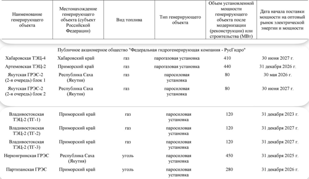 Хабаровская ТЭЦ-4 (410 МВт) и Артемовская ТЭЦ-2 (440 МВт) на ПГУ. Запуск Хабаровской в конце 2026-го, а Артемовской — летом 2027 года.