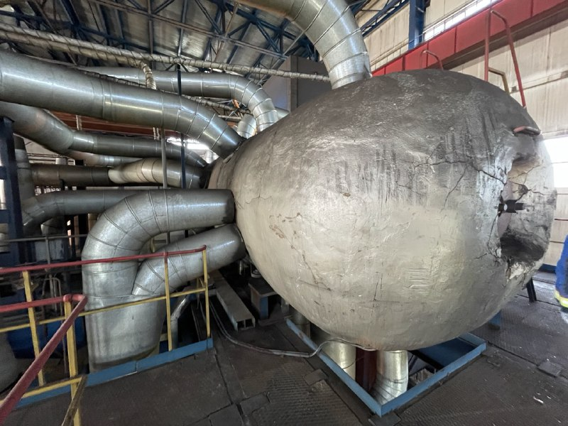 Котел отличается от остальных котлов станции и тем, что он очень большой. Поэтому бригады работают на разных его отметках, самая высокая — 46 метров, высотой с пятнадцатиэтажный дом. На этой отметке одна из бригад СГК ремонтирует барабан котлоагрегата.