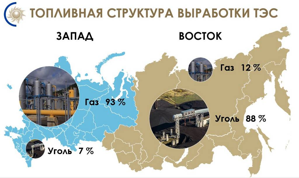 При этом в европейской части страны в топливной структуре выработки электроэнергии на тепловых электростанциях преобладает природный газ, составляющий 93 %, уголь занимает 7 %. Прямо противоположная картина складывается в Сибирском и Дальневосточном федеральных округах, где соотношение используемого на ТЭС природного газа и угля составляет 12 % и 88 %.