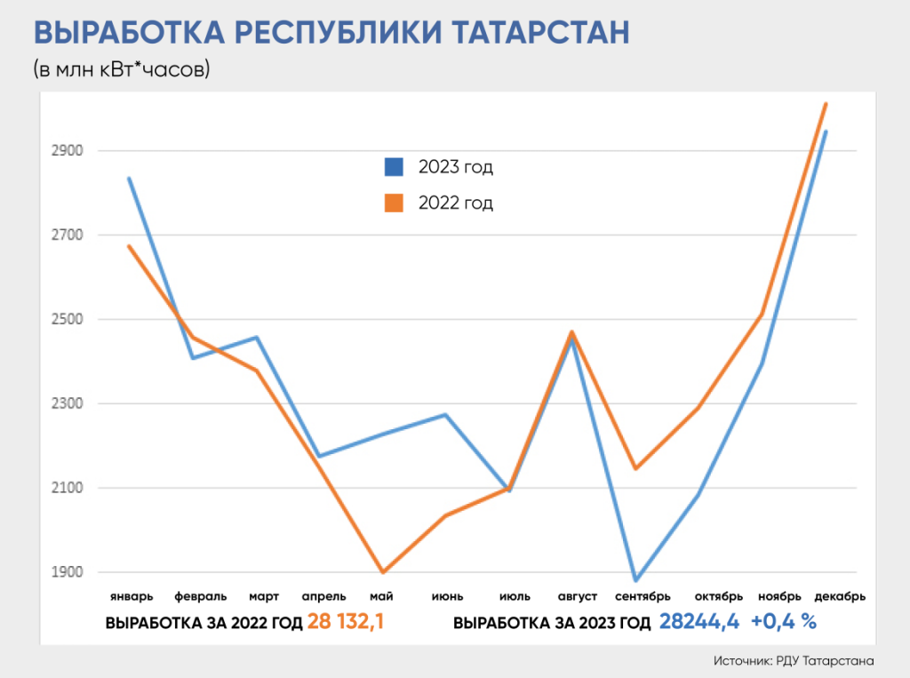 — Прямой корреляции между показателями потребления и выработки в Татарстане нет, энергосистема республики функционирует в составе ЕЭС России, а потому динамика в генерации в большей степени определяется работой электростанций на оптовом рынке. Суммарная выработка электроэнергии 26 электростанциями Татарстана за прошлый год выросла на 0,4% к показателям 2022 года.