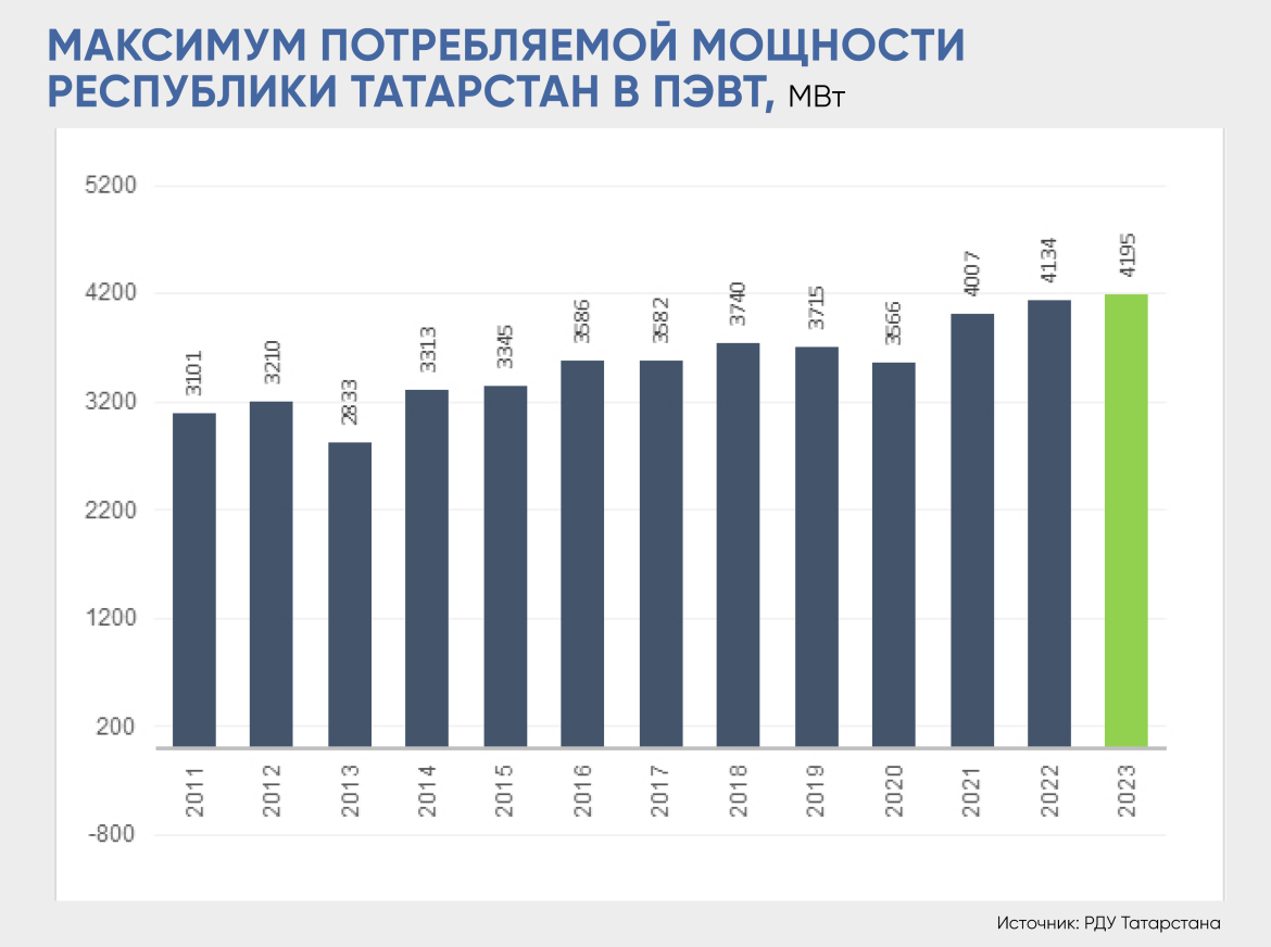 Исторический максимум потребления мощности в Татарстане, зафиксированный в 1991 году на уровне 4699 МВт, продержался 30 лет. Начиная с 2021-го ежегодно устанавливается новая, превышающая его величина. Так, в первые рабочие дни января 2023 года исторический максимум был обновлен до величины 4947 МВт, а потом, в декабре, до 5102 МВт. Вообще республиканская энергосистема впервые в истории преодолела планку в 5 ГВт.