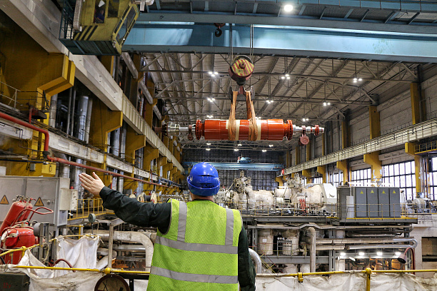 На Киришской ГРЭС ПАО «ОГК-2» проведена ключевая операция по монтажу турбогенератора ТГ-1Т. Ротор длиной 8 метров и весом 29 тонн с помощью мостового крана, системы рычагов и талей заведен в статор генератора.