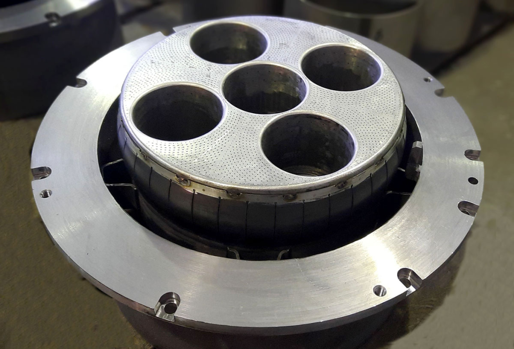 Крышка 4+1 является важным компонентом камеры сгорания, которая предназначена для ограничения объема зоны горения и совместно с топливными форсунками формирует аэродинамику факела в зоне горения. Это сложное по геометрии изделие, представляет из себя разделитель потоков, в торцевой части которого выполнено более 2000 охлаждающих отверстий, распложенных под разными углами. Для изготовления охлаждающих отверстий применялось современное оборудования, отвечающее высоким требованиям по точности и качеству обрабатываемой поверхности.