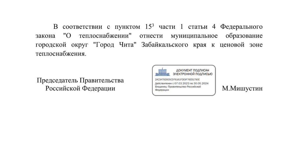Распоряжение об отнесении Читы к ценовой зоне теплоснабжения 28 февраля 2024 года подписал Председатель Правительства РФ Михаил Мишустин. В ближайшие 15 лет ПАО «ТГК-14» планирует инвестировать в развитие централизованного теплоснабжения столицы Забайкальского края более 15 млрд. рублей.