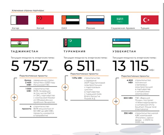 Ранее страны Центральной Азии активно развивали лишь сегмент ВИЭ, прежде всего, руками китайских компаний. Также крупными игроками регионального рынка зелёной энергетики являются инвесторы из ОАЭ и Саудовской Аравии. В прошлом году государственная энергетическая инвесткорпорация Китая (CPIH) и SANY Renewable Energy подписали соглашения о строительстве в Казахстане 1 ГВт ВЭС и локализации производства оборудования для них. В октябре «Самрук-Энерго» и Power China Resources Ltd. заявили о планах увеличить мощность ВЭС в Алма-Атинской области, введённой в эксплуатацию в прошлом году, с эксплуатацию в прошлом году, с 60 до 810 МВт. В декабре с французской TotalEnergies, саудовской ACWA Power и эмиратской Masdar были подписаны соглашения о строительстве ещё трёх ветропарков суммарной мощностью 3 ГВт.