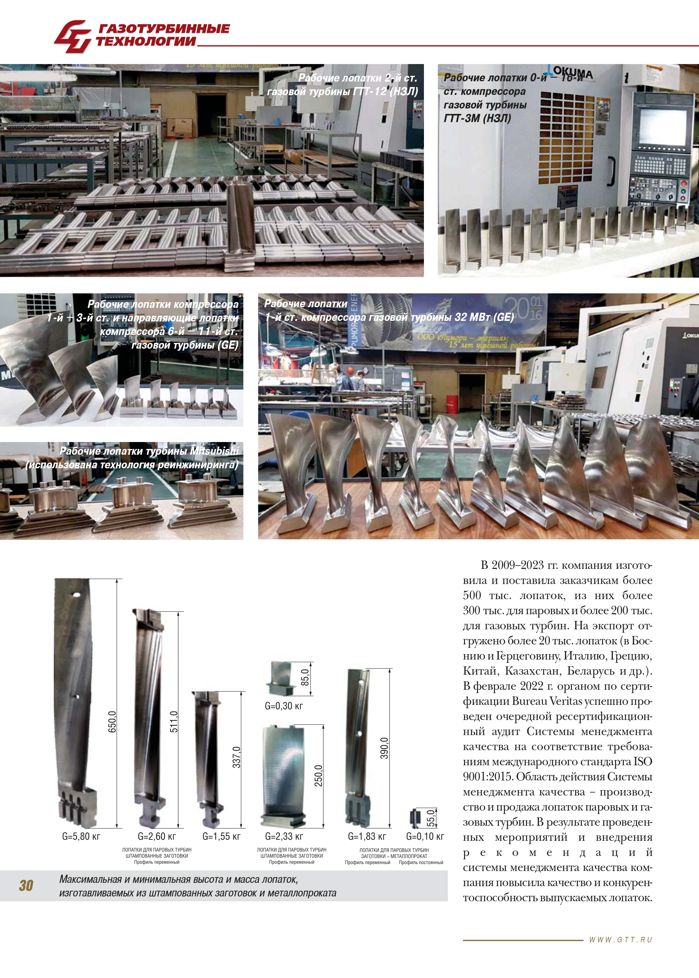 В 2009–2023 гг. компания изготовила и поставила заказчикам более 500 тыс. лопаток, из них более 300 тыс. для паровых и более 200 тыс. для газовых турбин. На экспорт отгружено более 20 тыс. лопаток (в Боснию и Герцеговину, Италию, Грецию, Китай, Казахстан, Беларусь и др.).