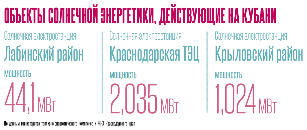 На Кубани развиваются проекты и в сфере альтернативной энергетики. В регионе сегодня реализуется восемь проектов по строительству генерирующих объектов с использованием возобновляемой энергетики в семи муниципальных образованиях края. Среди них Краснодар, Армавир, а также Крыловский, Лабинский, Мостовский, Северский и Тихорецкий районы. На сегодня в регионе действуют три объекта солнечной энергетики.