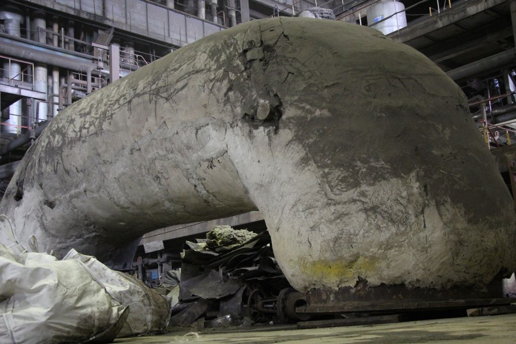 Огромного размера котёл, уходящий куда-то в высь, в прямом смысле слова отмывают. Стадия очистки оборудования происходит как снаружи, так и внутри. Всё, что наработано годами в ходе его эксплуатации, а это в основном угольная пыль, полностью удаляется. Зрелище с точки зрения эстетики не совсем красивое, но этот этап — необходимая подготовительная часть, предшествующая большому ремонту.